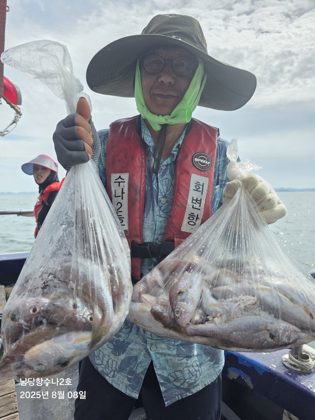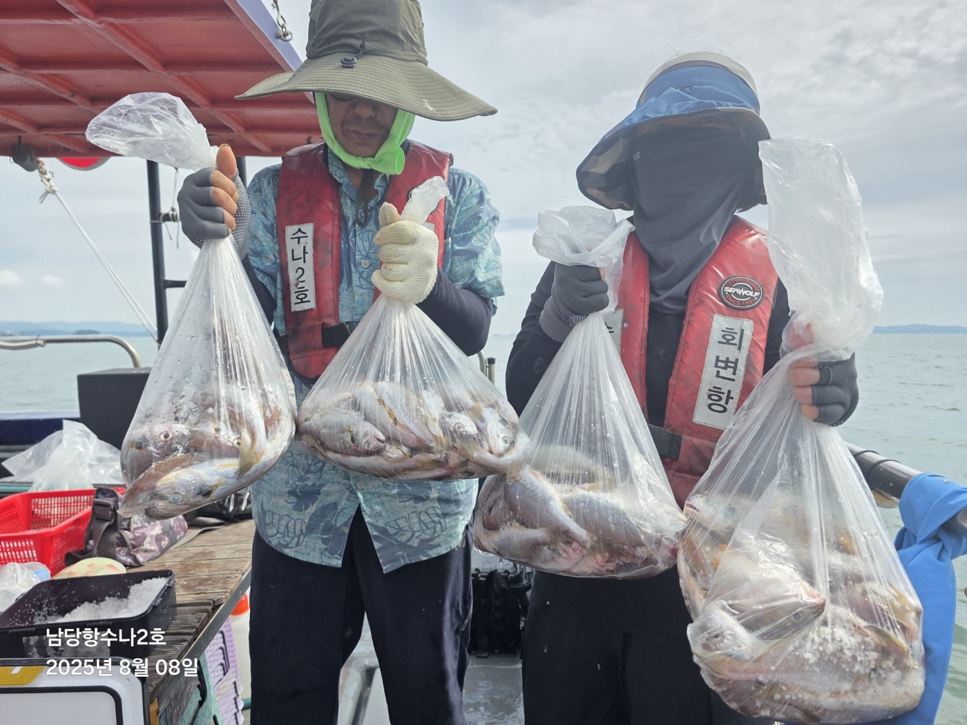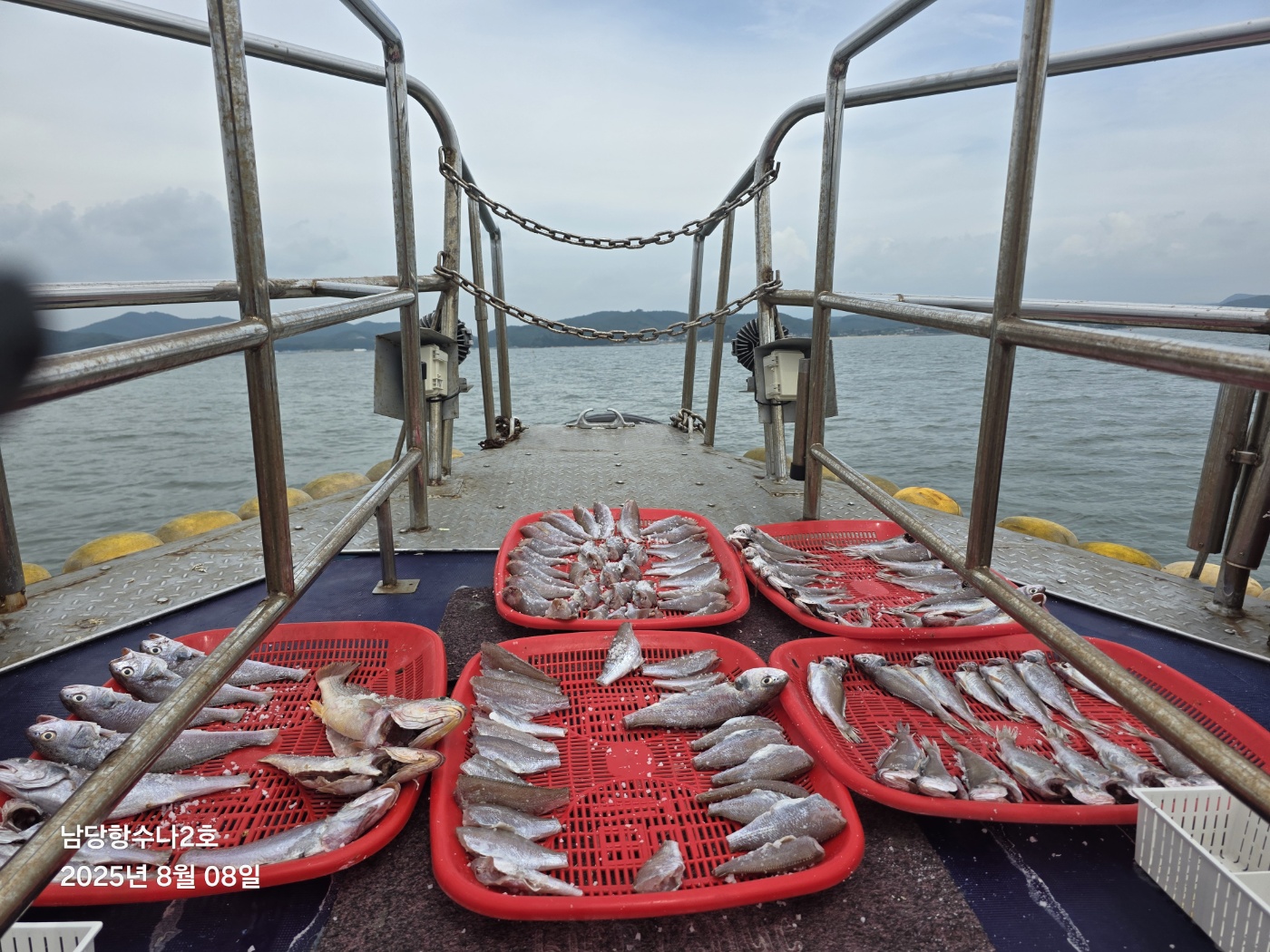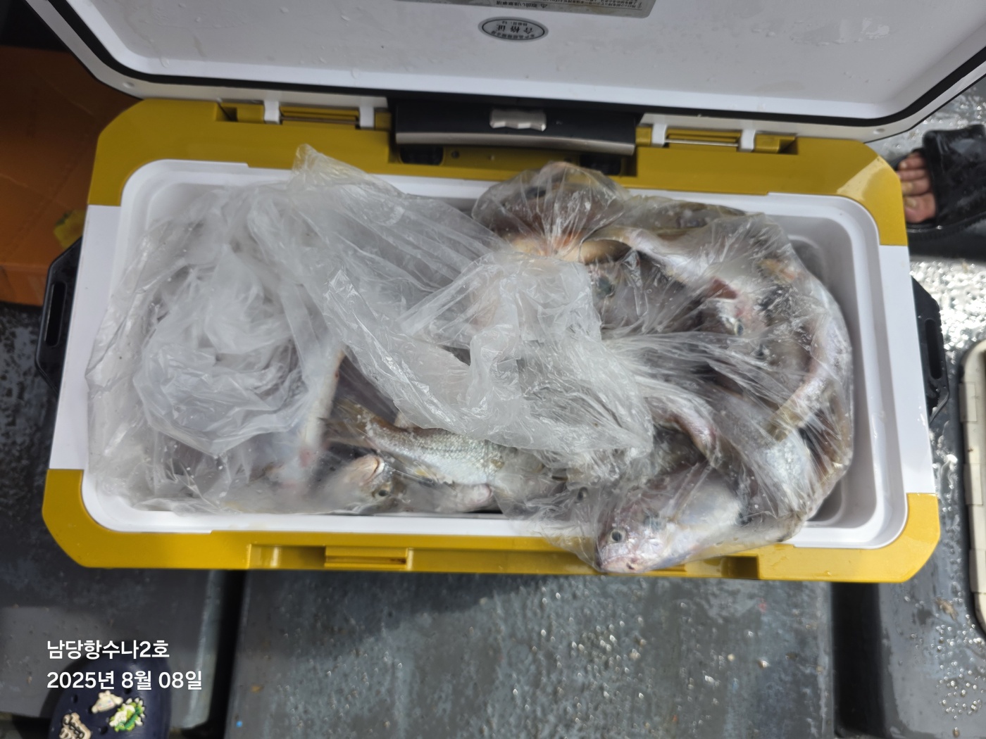 저희수나2호를 찿아주신 조사님들께 감사드립니다. 오늘도 수고 많이 하셨습니다. 8월8일 수나2호 조황사진입니다. 백조기잡고왔습니다..,