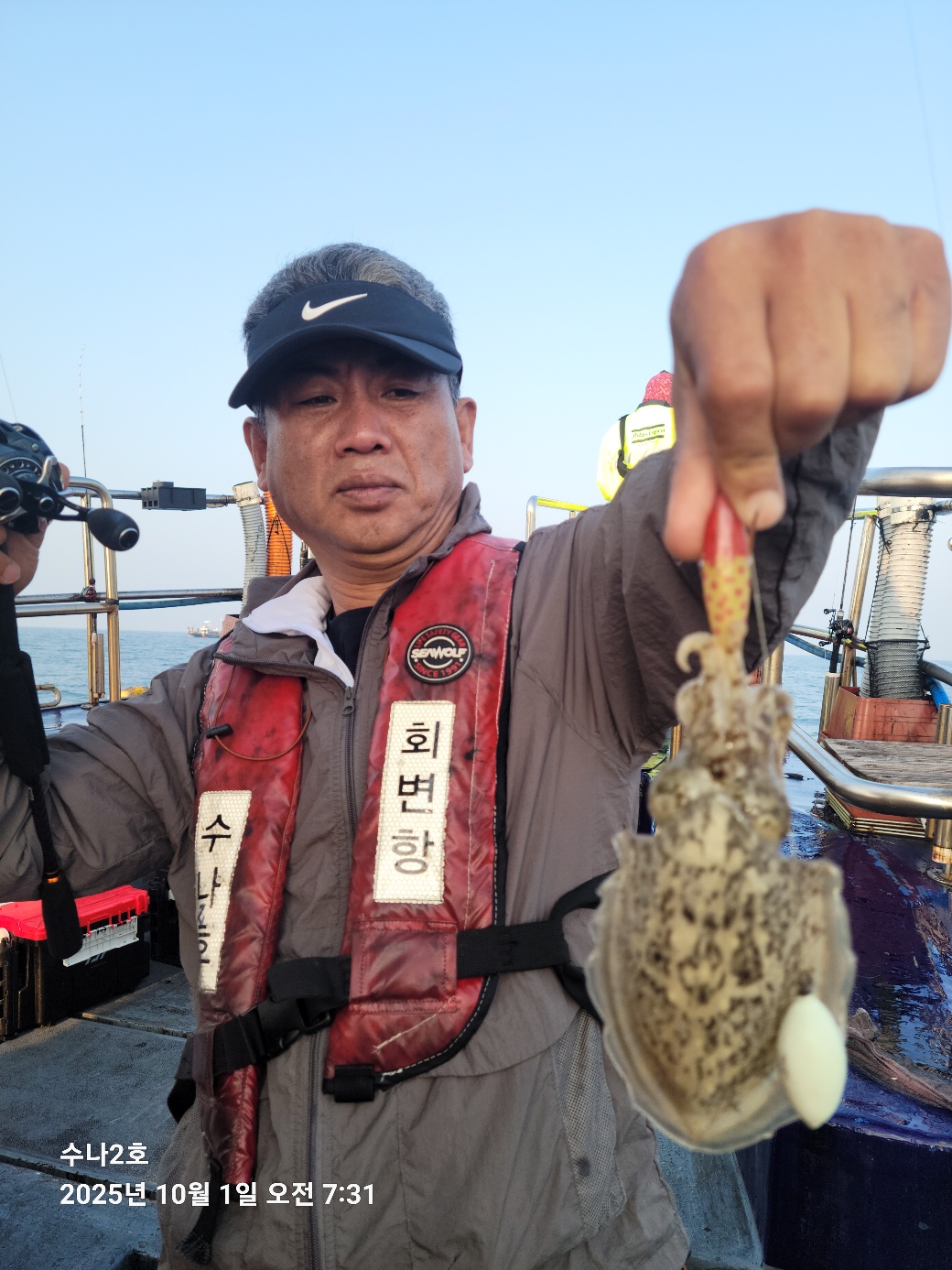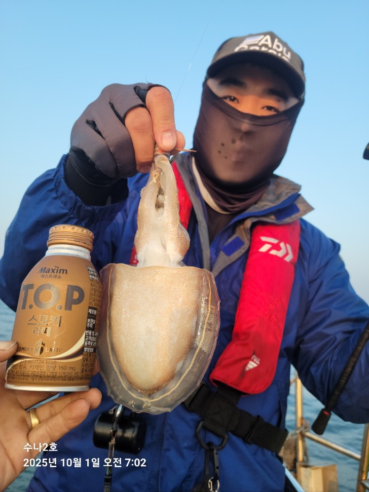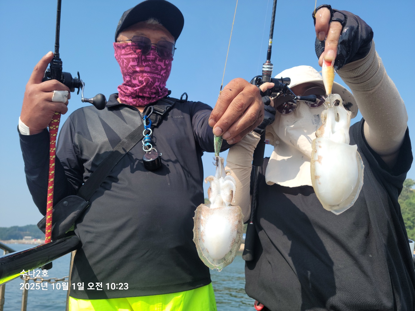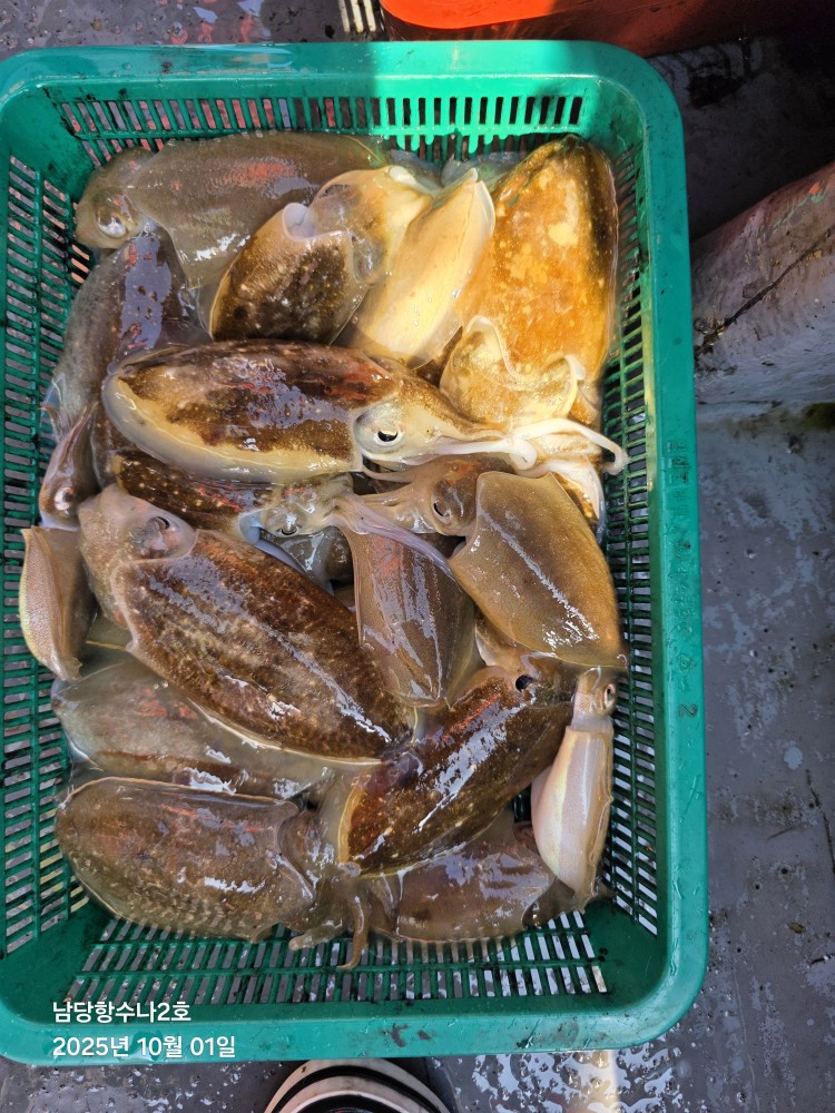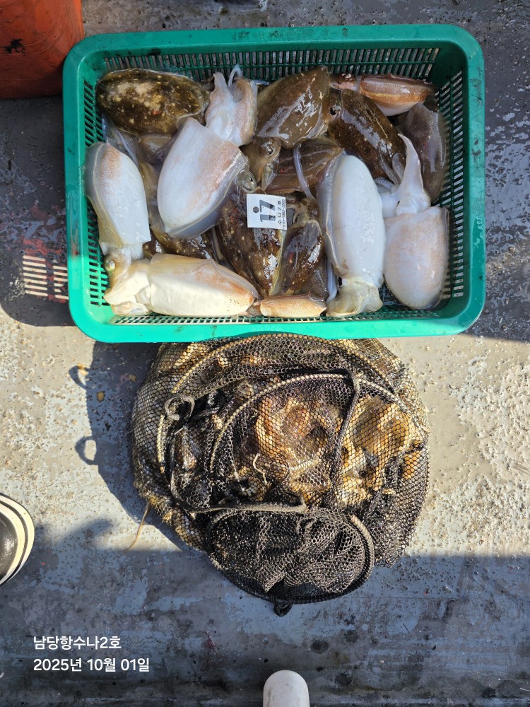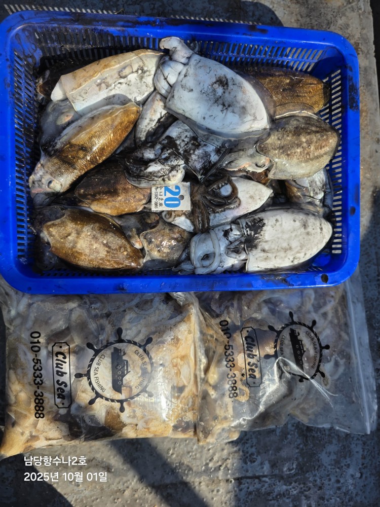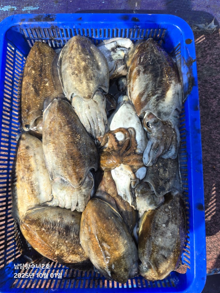 저희수나2호를 찿아주신 조사님들께 감사드립니다. 오늘도 수고 많이 하셨습니다. 10월1일 수나2호 조황사진입니다. 갑오징어.주꾸미 잡고왔습니다... 장원분과 최고연장조사님께는 바다에서 조업배 운영하는 지인을 만나 건네준