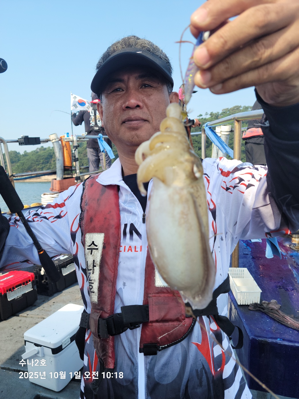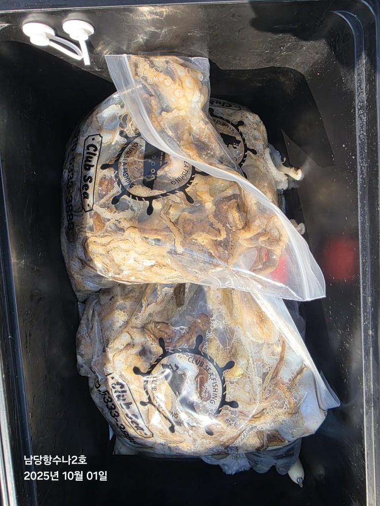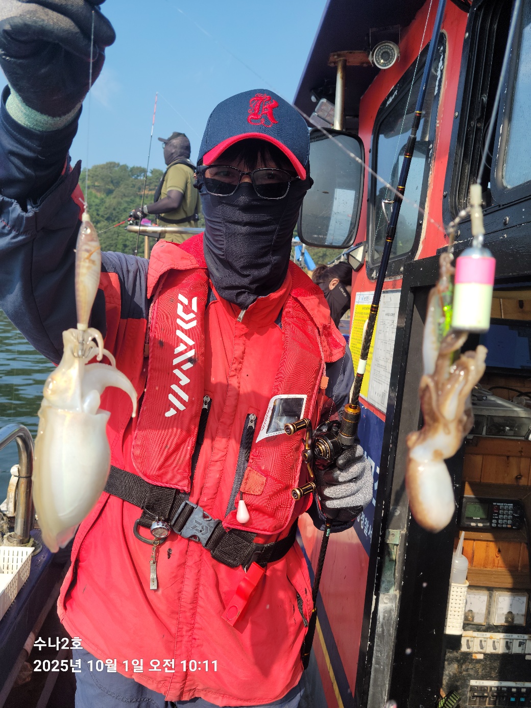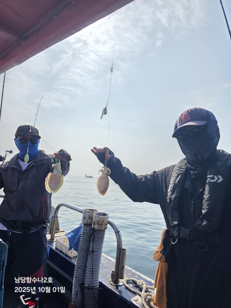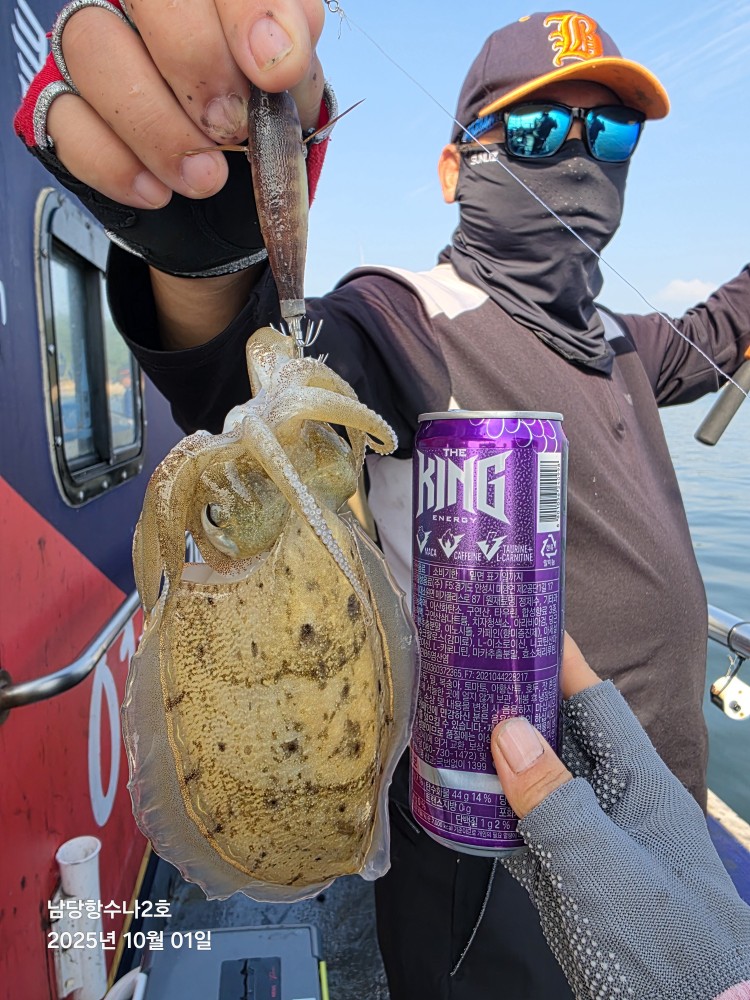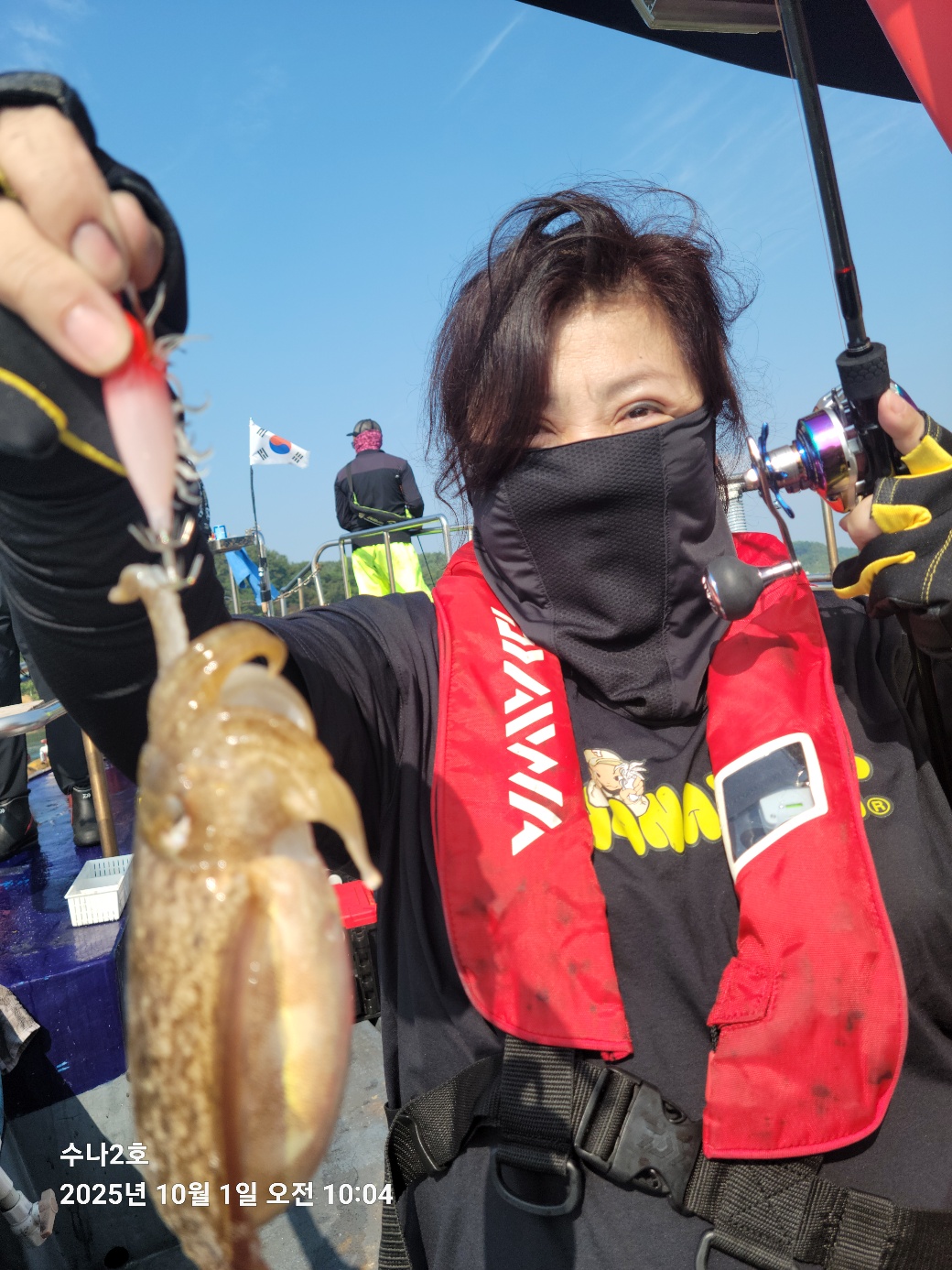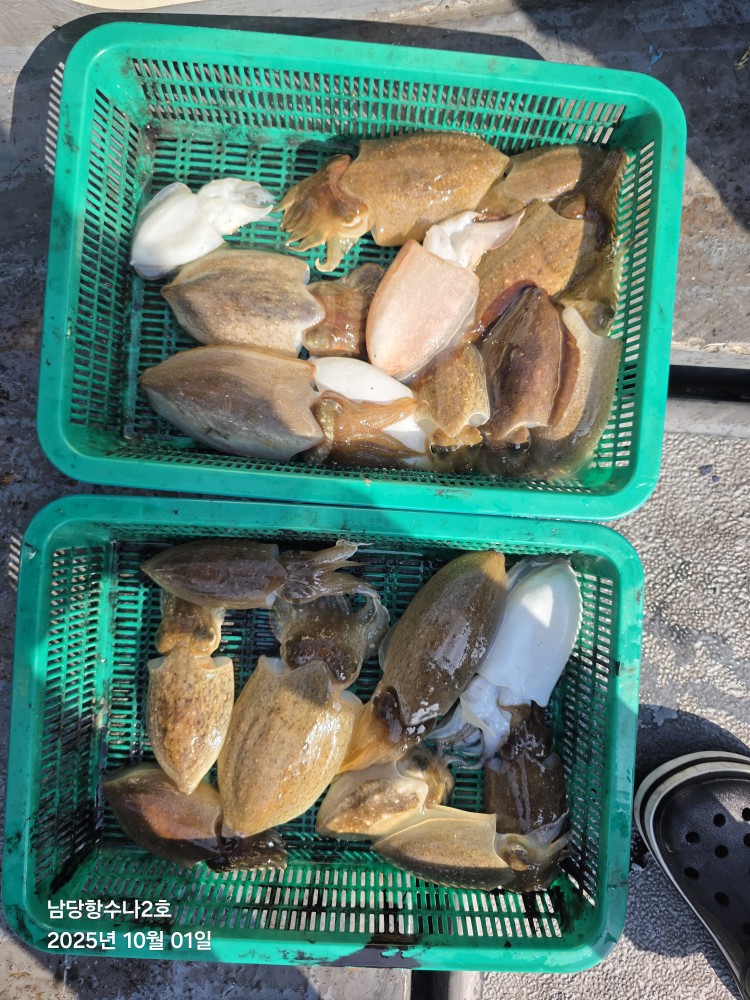 저희수나2호를 찿아주신 조사님들께 감사드립니다. 오늘도 수고 많이 하셨습니다. 10월1일 수나2호 조황사진입니다. 갑오징어.주꾸미 잡고왔습니다... 장원분과 최고연장조사님께는 바다에서 조업배 운영하는 지인을 만나 건네준